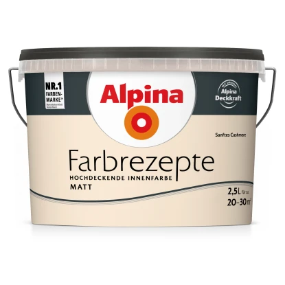 Alpina Farbrezepte Sanftes Cashmere ist ein heller Creme-Ton, der als Flächenton eine freundliche Atmosphäre schafft. Er lässt sich aber auch nach Wunsch mit nahezu allen Akzent- und Begleittönen kombinieren. Sein sanfter, weicher Charakter wird besonders in Kombination mit den Farbtönen der Farbrezepte einfach lebendig und einfach geborgen betont.
