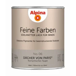 Alpina Feine Farben Lack – 34 edelmatte Buntlacke mit Persönlichkeit für Möbel mit Charakter. Jede einzelne dieser zeitlos-klassischen Nuancen besitzt eine einzigartige Inspirationsgeschichte. In harmonischer Kombination mit den Feine Farben Wandfarben schaffen sie ein edles, vollendetes Raumgefühl. Erlesene Pigmente sorgen für eine beeindruckende Farbtiefe und sehr gute Farbbeständigkeit. Die besonders deckende und hochergiebige Lackqualität überzeugt durch ein perfektes Lackierergebnis sowie eine gleichmäßige, edelmatte und strapazierfähige Oberfläche.