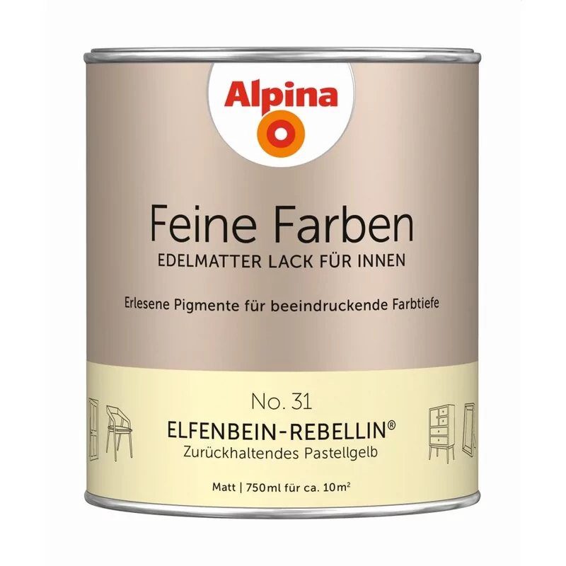 Alpina Feine Farben Lack – 34 edelmatte Buntlacke mit Persönlichkeit für Möbel mit Charakter. Jede einzelne dieser zeitlos-klassischen Nuancen besitzt eine einzigartige Inspirationsgeschichte. In harmonischer Kombination mit den Feine Farben Wandfarben schaffen sie ein edles, vollendetes Raumgefühl. Erlesene Pigmente sorgen für eine beeindruckende Farbtiefe und sehr gute Farbbeständigkeit. Die besonders deckende und hochergiebige Lackqualität überzeugt durch ein perfektes Lackierergebnis sowie eine gleichmäßige, edelmatte und strapazierfähige Oberfläche.
